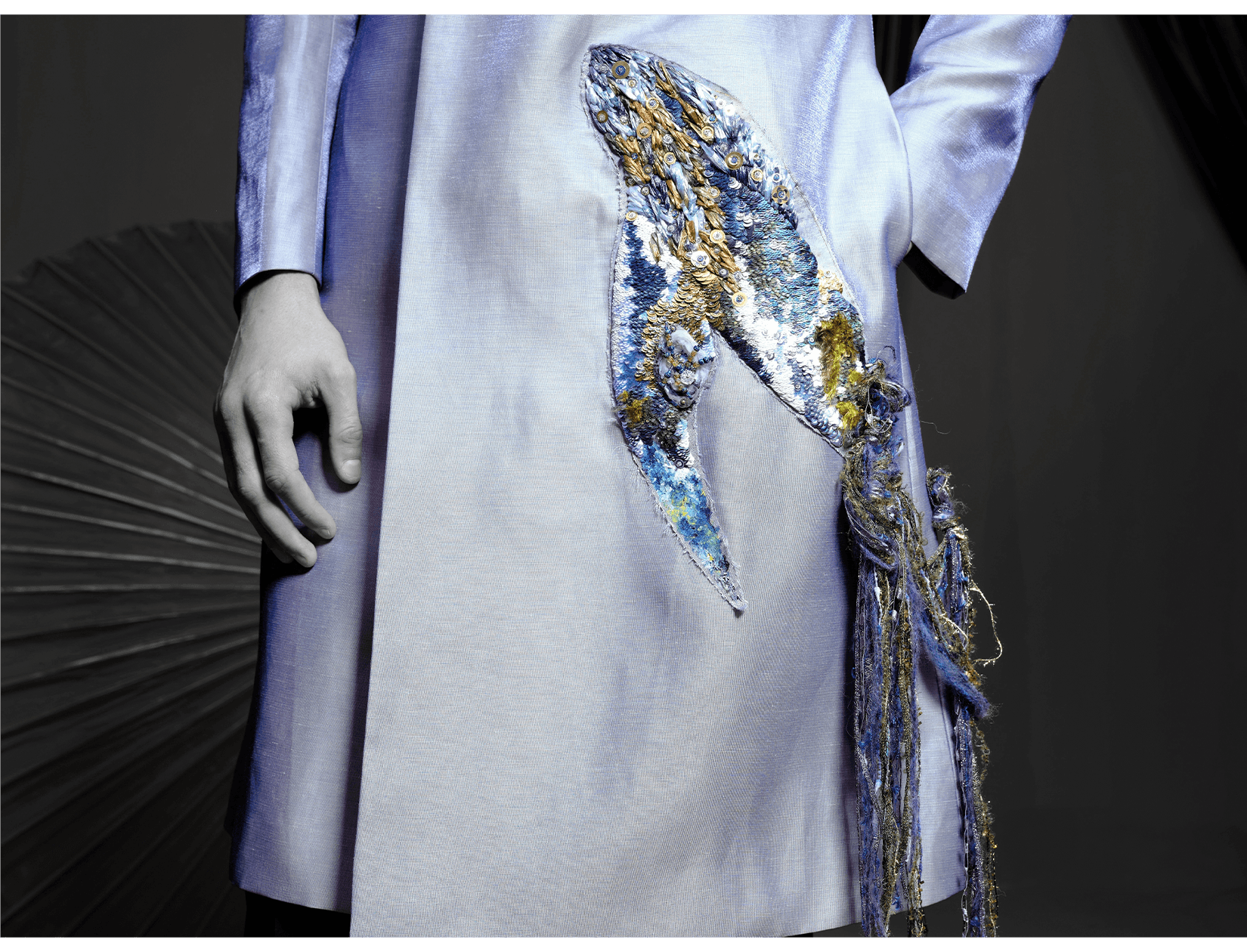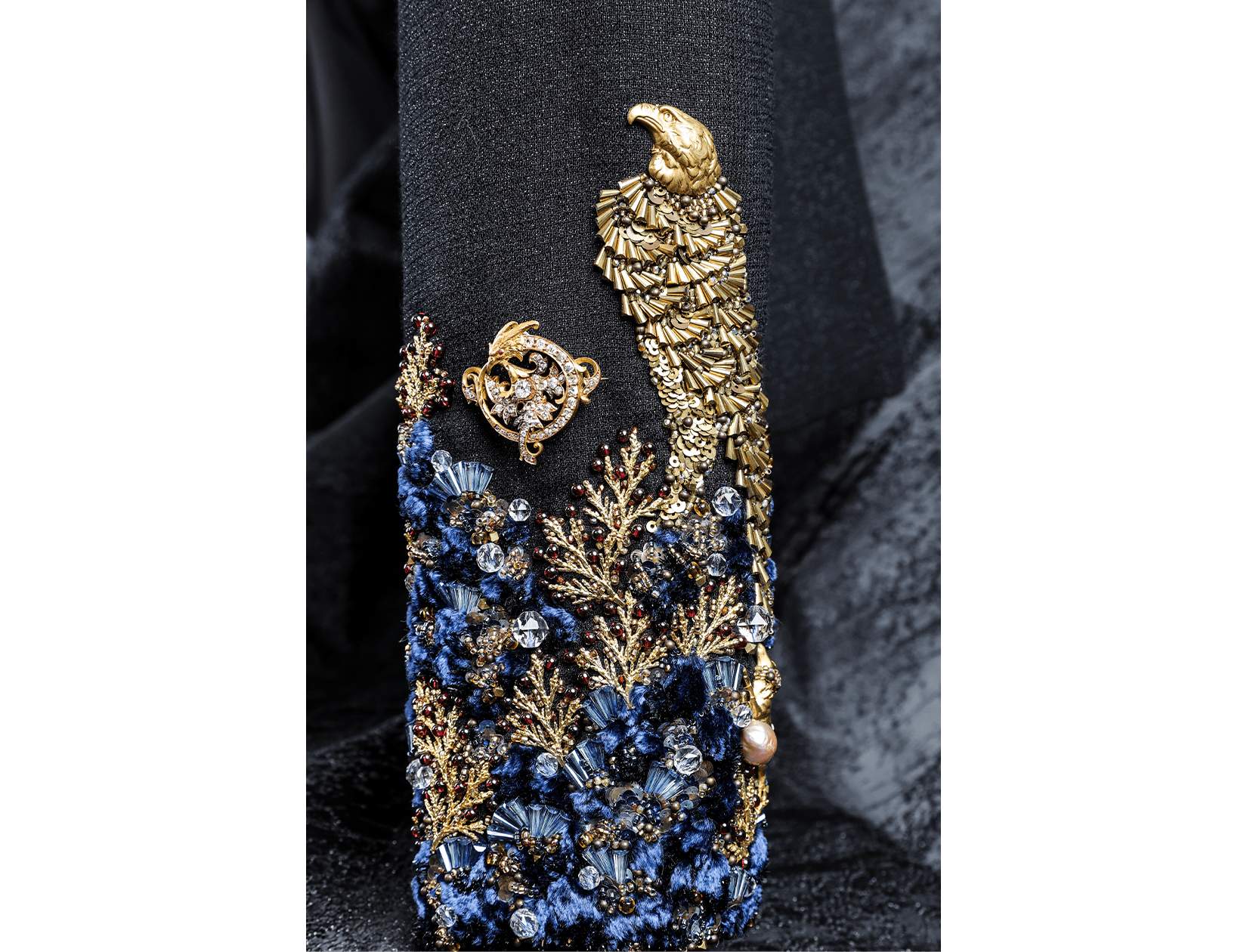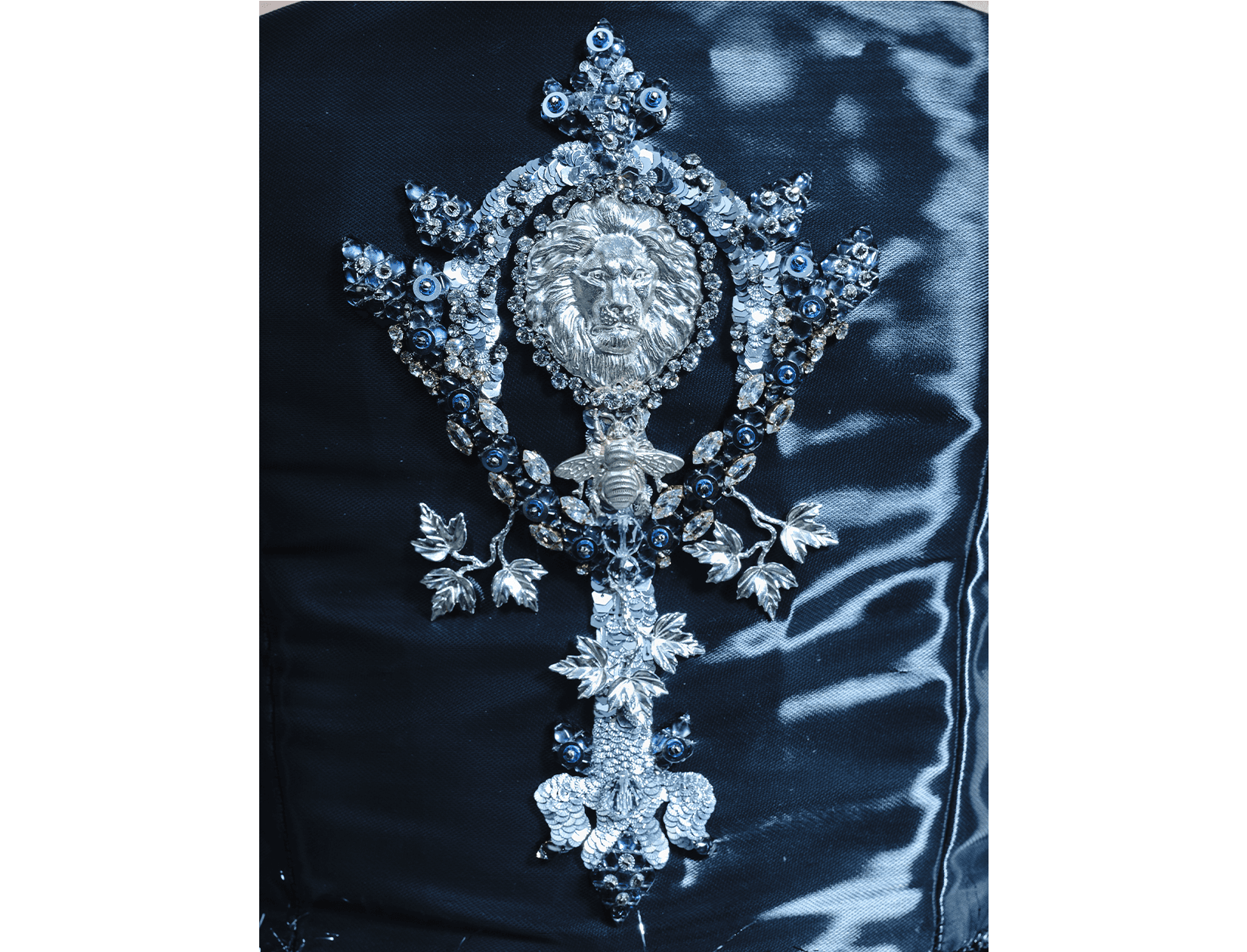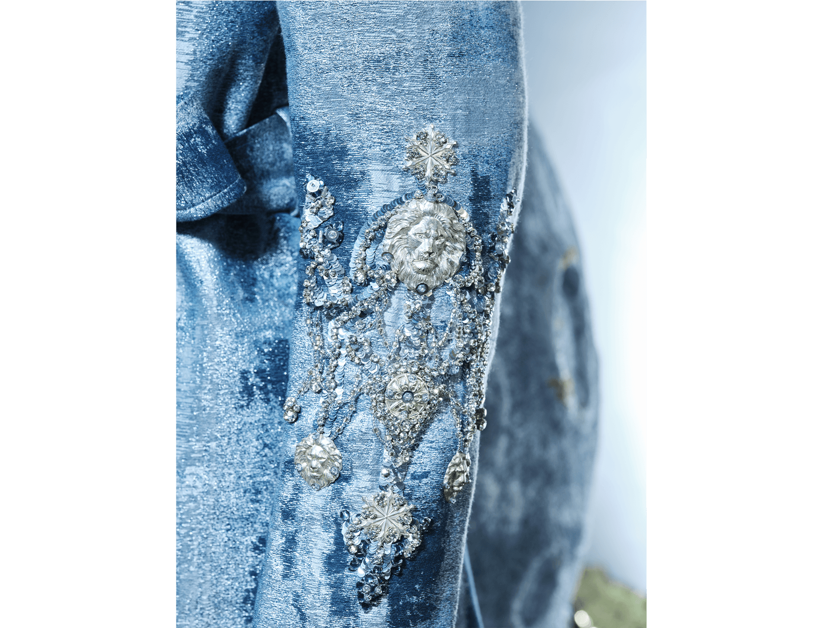 Ray Sorlentyr departs from the traditional French crochet-based method, and has developed a new approach he calls “Wireless Composition”. Working on a wide range of textiles, he uses classical hand-stitching from the front of the fabric with double-stranded thread, anchoring every element at intervals of just 0.5–1 mm. Each material is placed with precision, and every visible thread is carefully concealed. This process takes up to four times longer than conventional French embroidery, but the result is a surface that behaves less like embellishment and more like a painting: motifs appear as subtle, flowing gradients, while sequins, rhinestones, and even advanced contemporary materials interact to form a unified, luminous embroidered tableau.