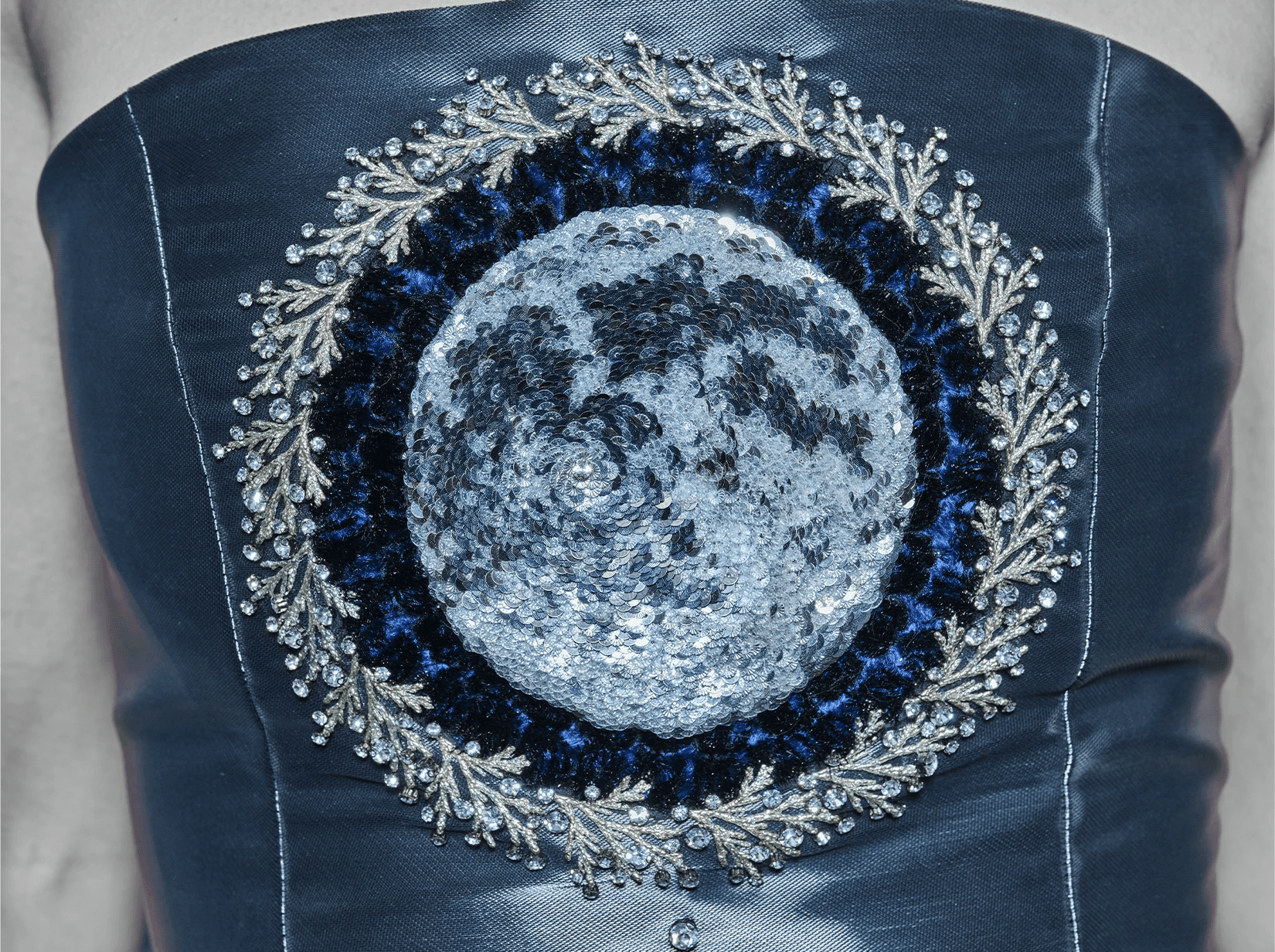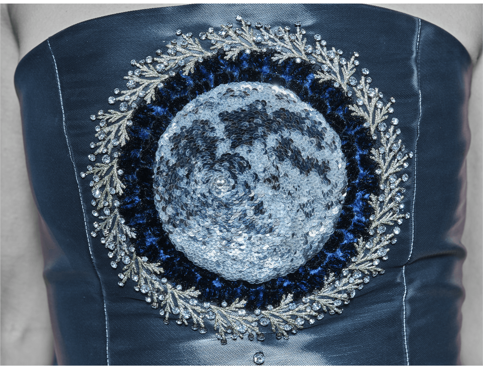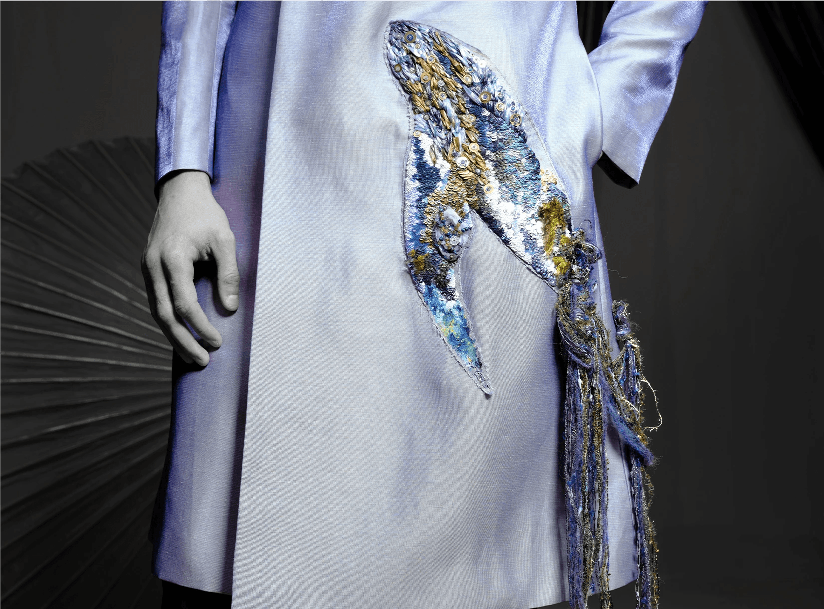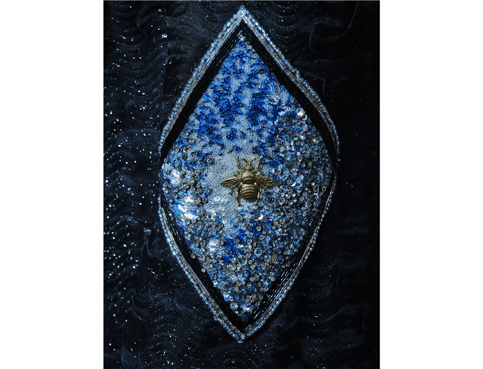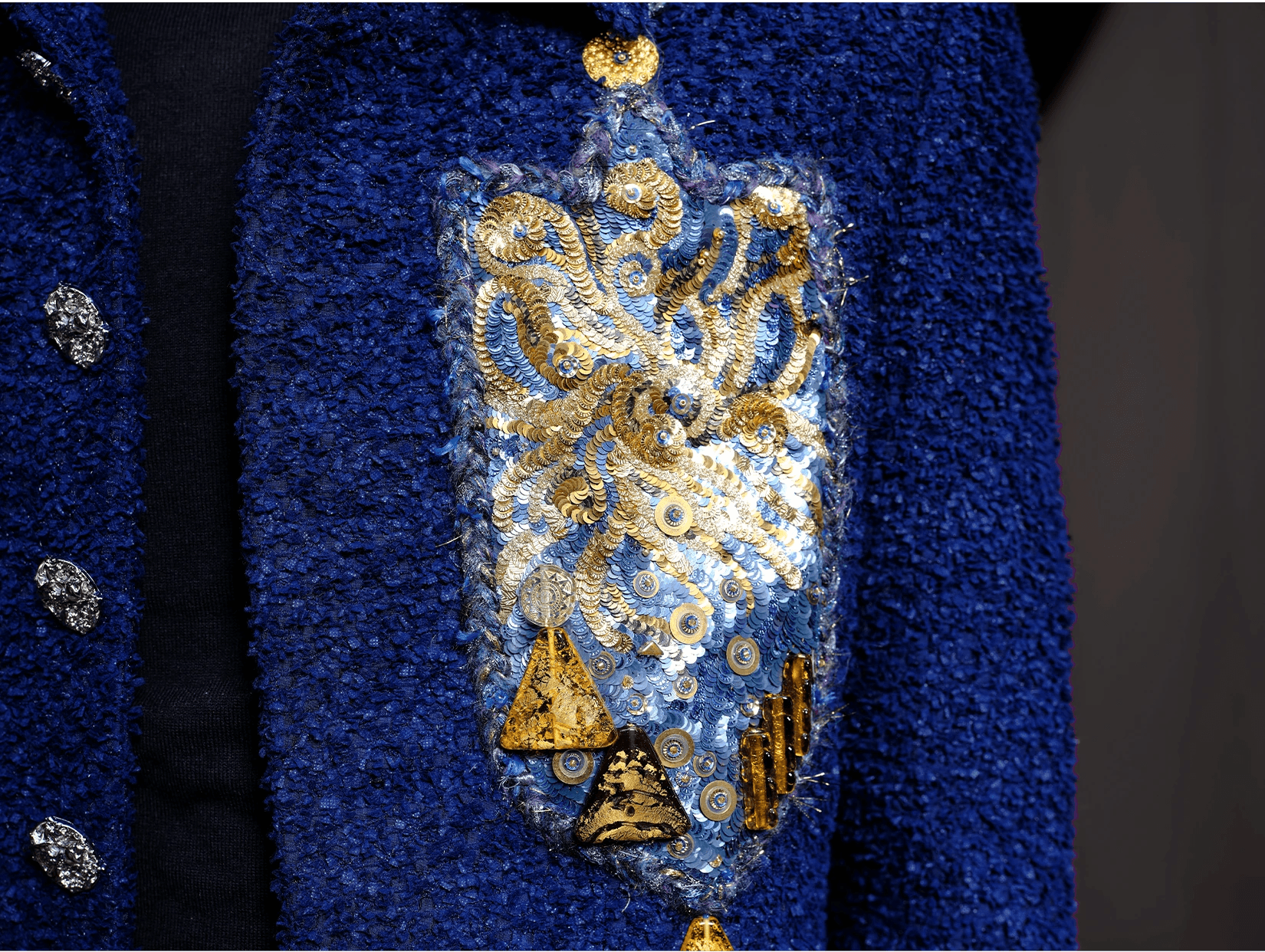 Ray Sorlentyr departs from the traditional French crochet-based method, and has developed a new approach he calls “Wireless Composition”. Working on a wide range of textiles, he uses classical hand-stitching from the front of the fabric with double-stranded thread, anchoring every element at intervals of just 0.5–1 mm. Each material is placed with precision, and every visible thread is carefully concealed. This process takes up to four times longer than conventional French embroidery, but the result is a surface that behaves less like embellishment and more like a painting: motifs appear as subtle, flowing gradients, while sequins, rhinestones, and even advanced contemporary materials interact to form a unified, luminous embroidered tableau.