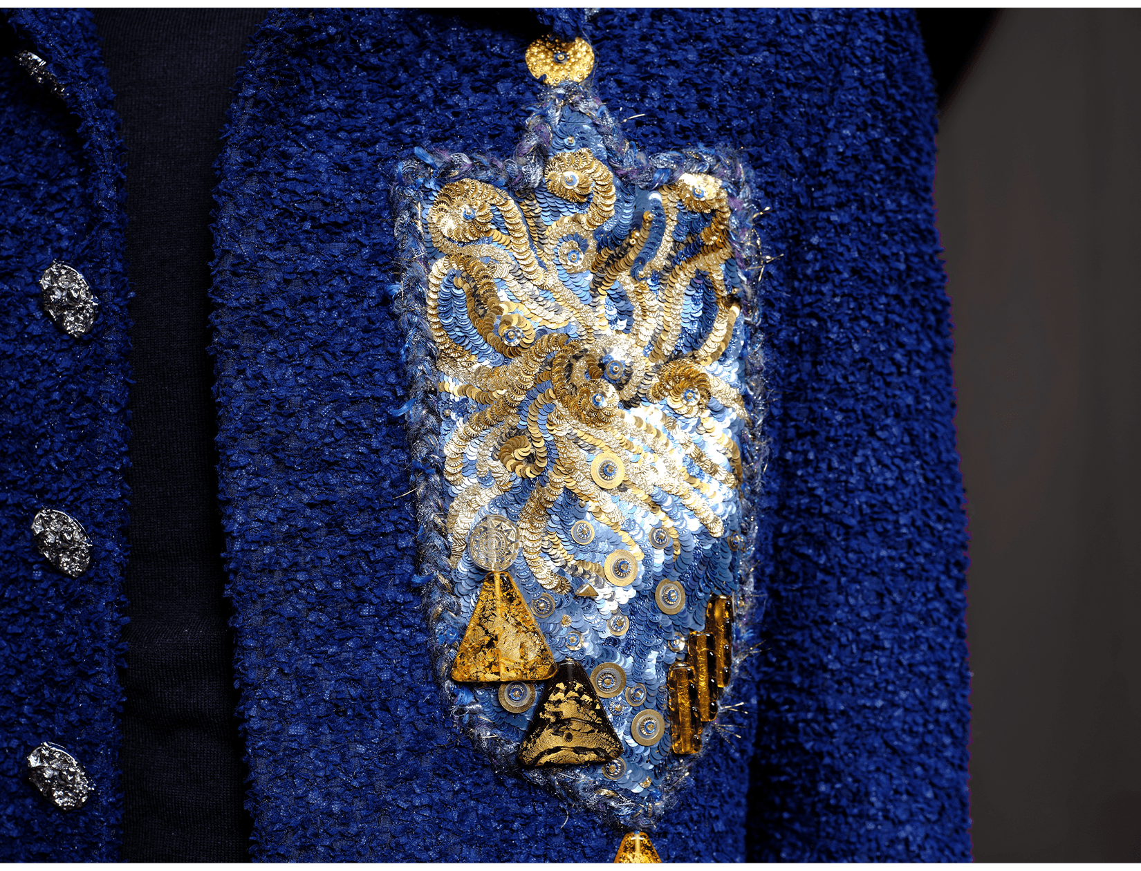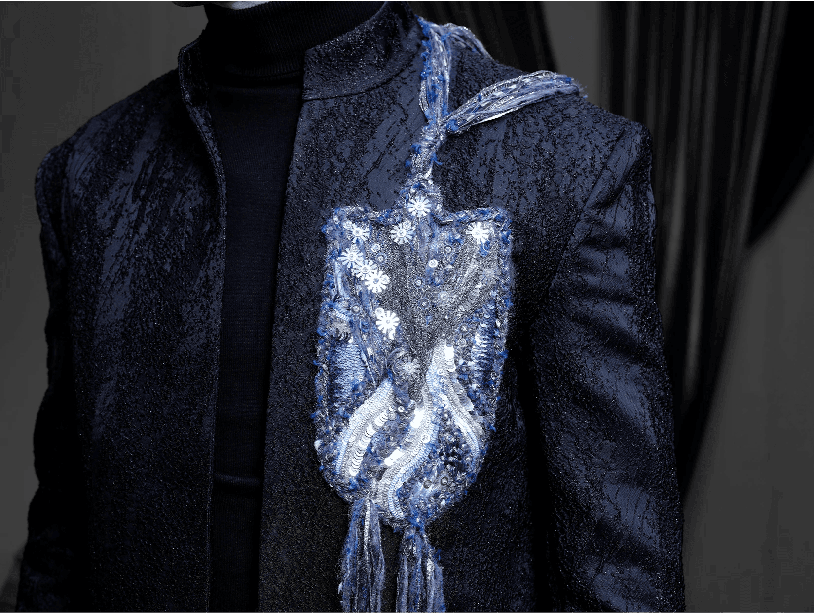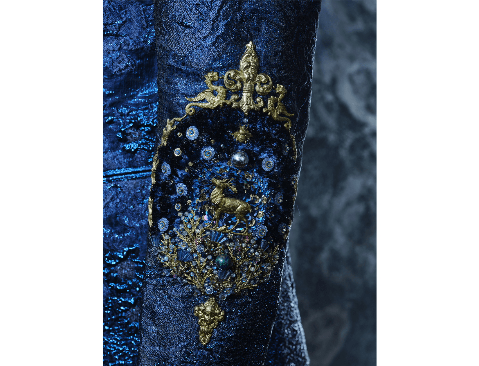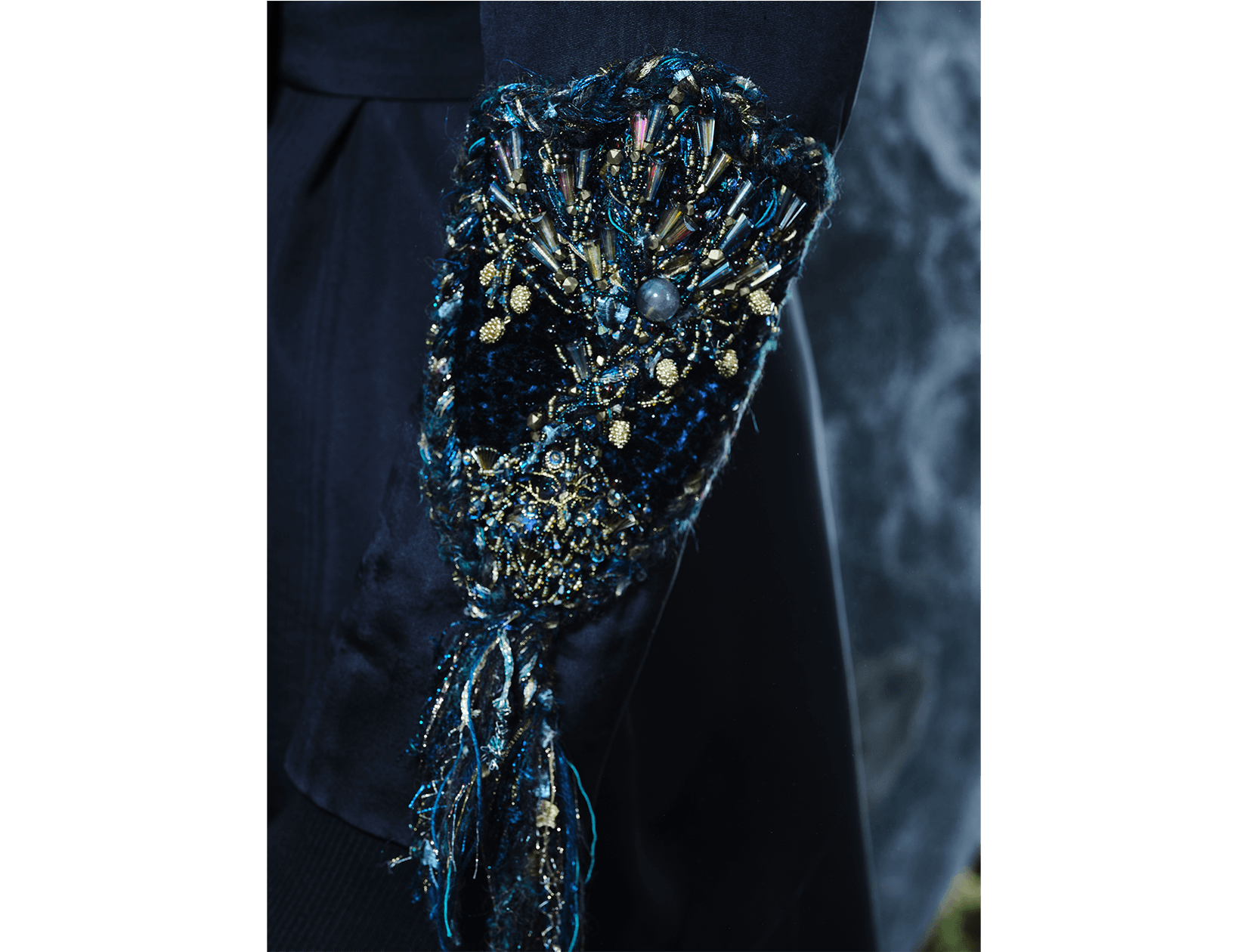 Ray Sorlentyr departs from the traditional French crochet-based method, and has developed a new approach he calls “Wireless Composition”. Working on a wide range of textiles, he uses classical hand-stitching from the front of the fabric with double-stranded thread, anchoring every element at intervals of just 0.5–1 mm. Each material is placed with precision, and every visible thread is carefully concealed. This process takes up to four times longer than conventional French embroidery, but the result is a surface that behaves less like embellishment and more like a painting: motifs appear as subtle, flowing gradients, while sequins, rhinestones, and even advanced contemporary materials interact to form a unified, luminous embroidered tableau.