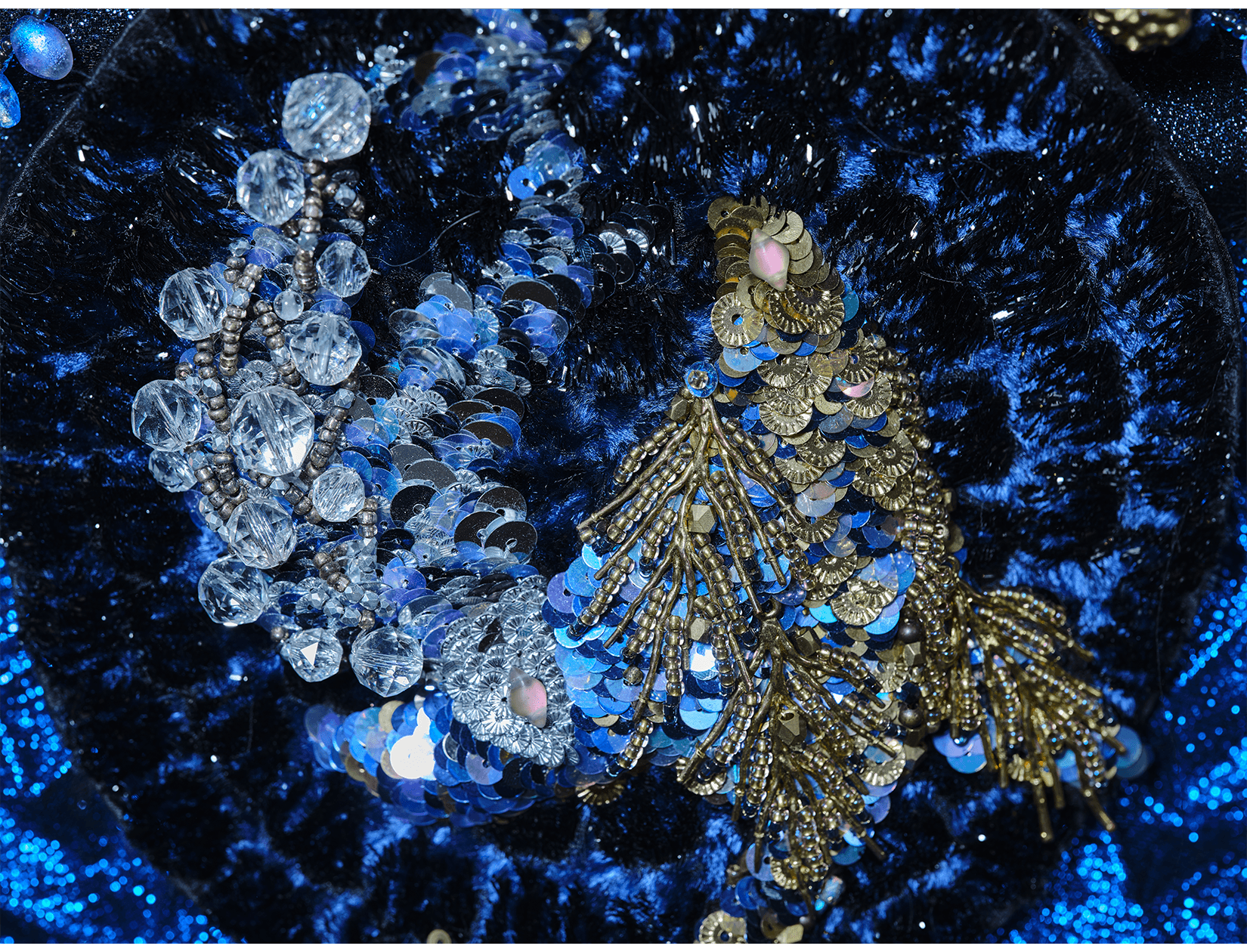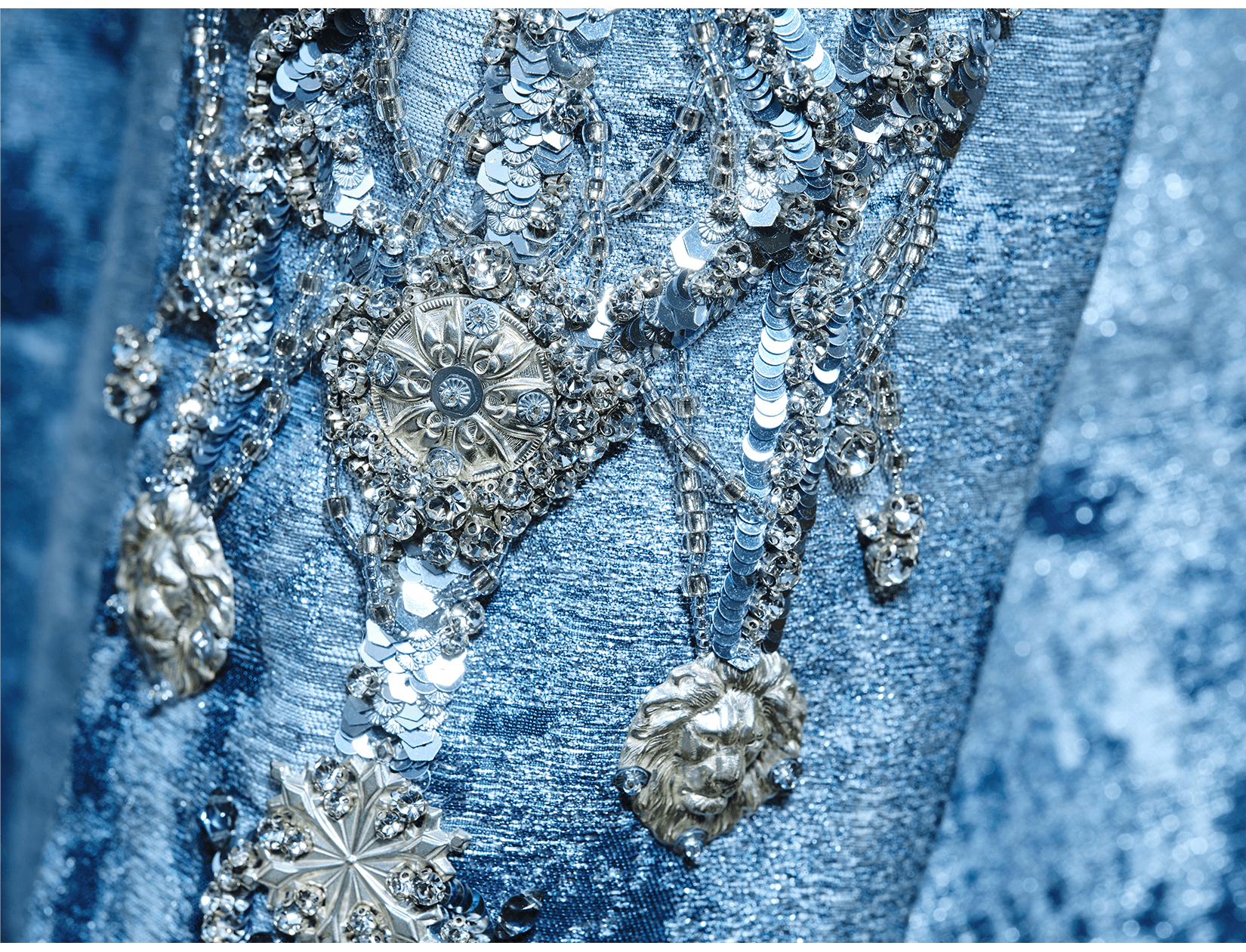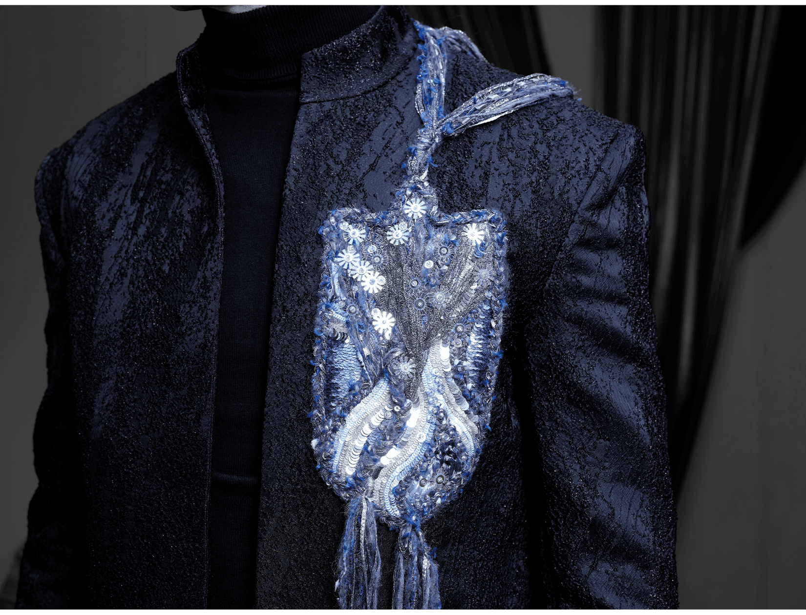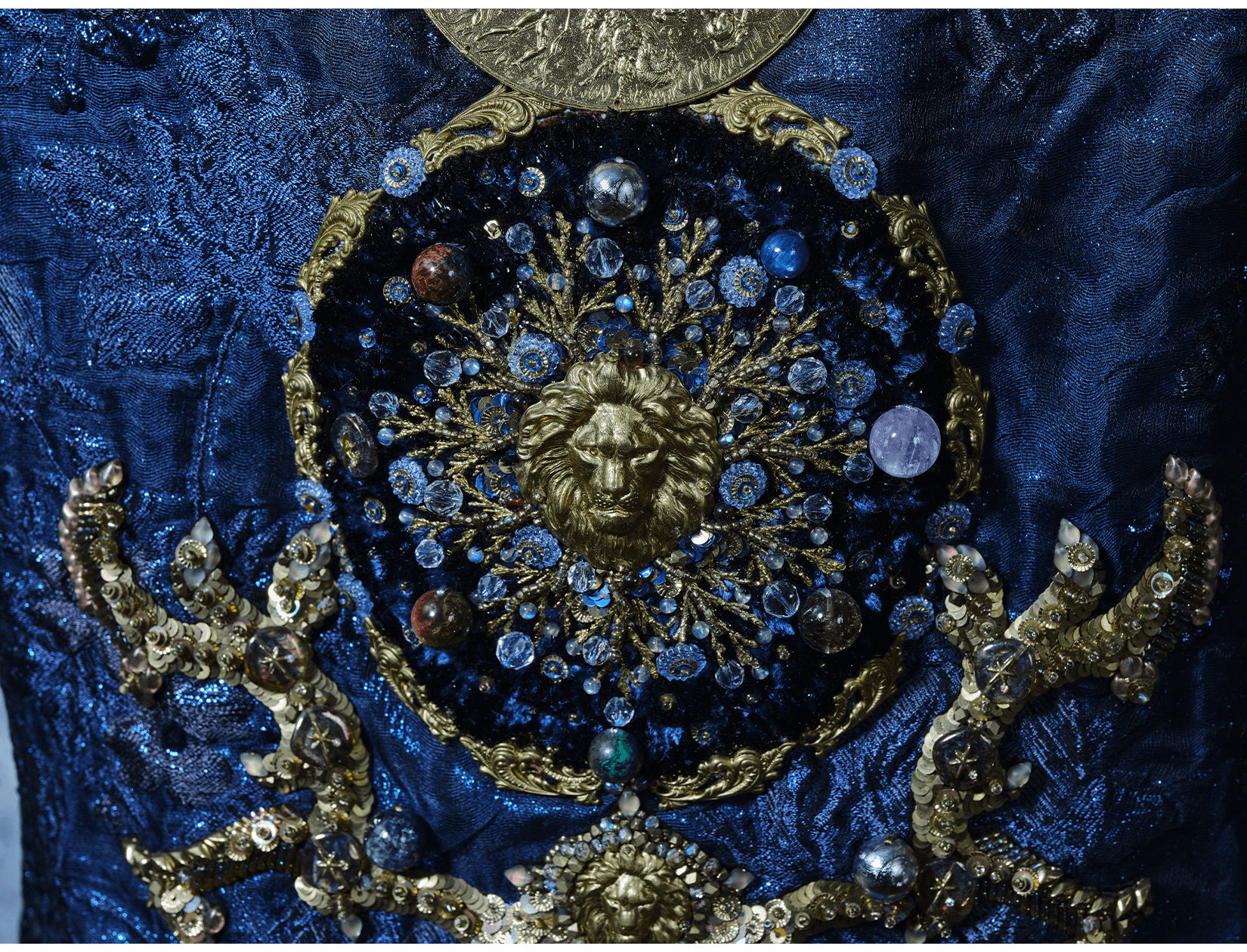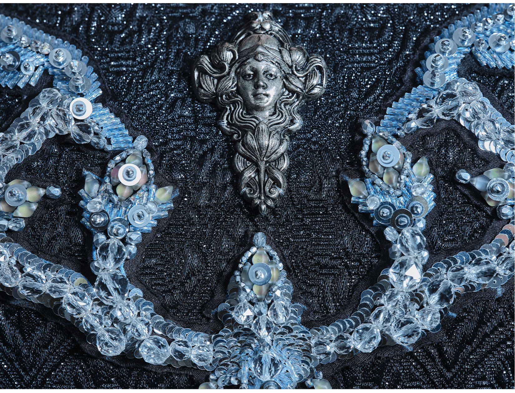 Ray Sorlentyr departs from the traditional French crochet-based method, and has developed a new approach he calls “Wireless Composition”. Working on a wide range of textiles, he uses classical hand-stitching from the front of the fabric with double-stranded thread, anchoring every element at intervals of just 0.5–1 mm. Each material is placed with precision, and every visible thread is carefully concealed. This process takes up to four times longer than conventional French embroidery, but the result is a surface that behaves less like embellishment and more like a painting: motifs appear as subtle, flowing gradients, while sequins, rhinestones, and even advanced contemporary materials interact to form a unified, luminous embroidered tableau.