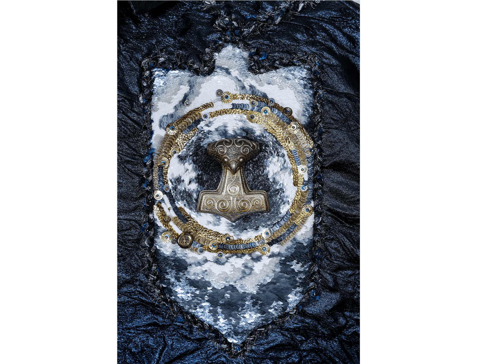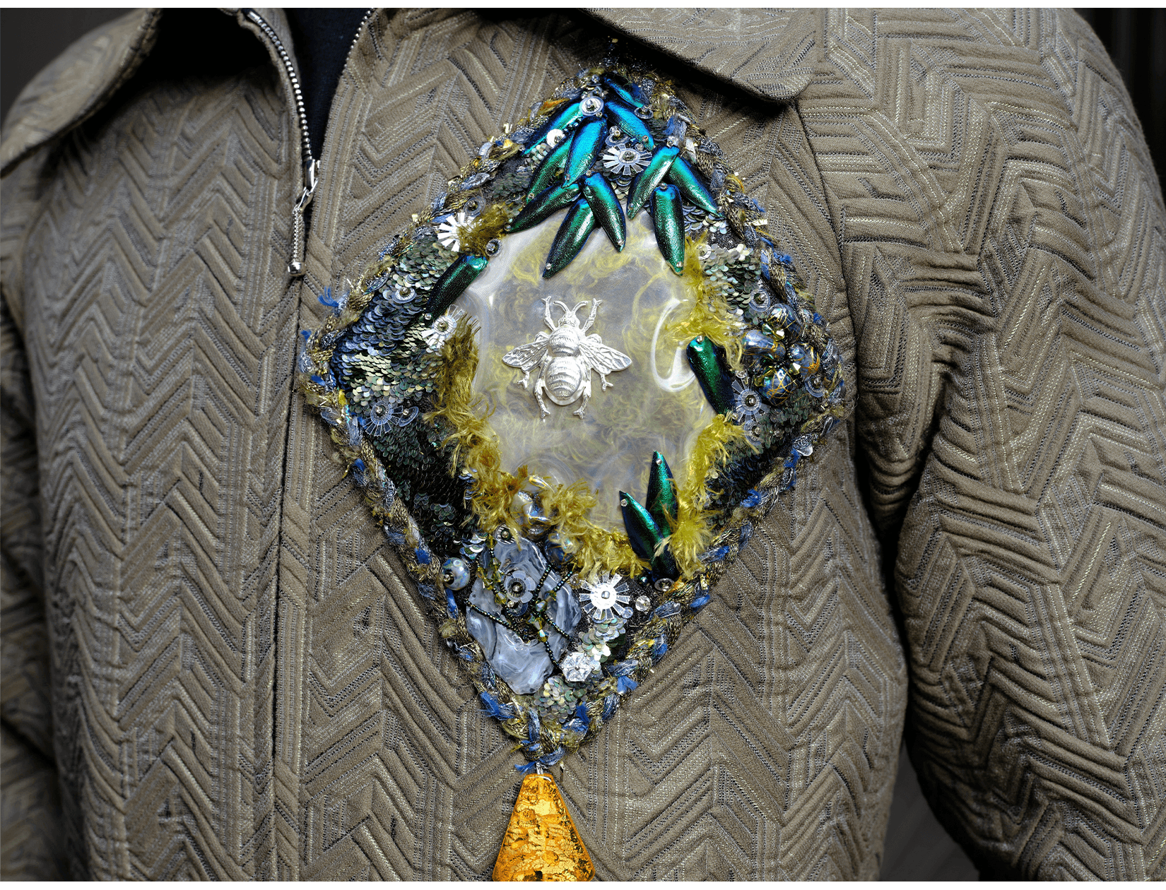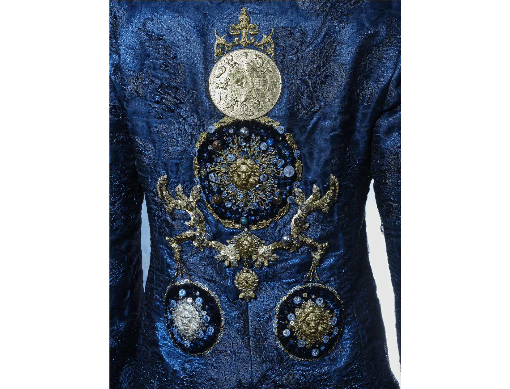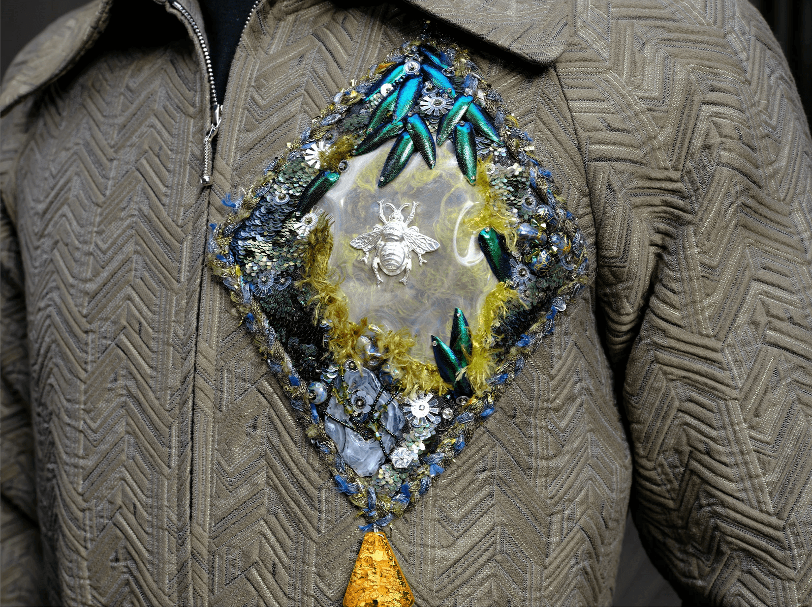 Ray Sorlentyr departs from the traditional French crochet-based method, and has developed a new approach he calls “Wireless Composition”. Working on a wide range of textiles, he uses classical hand-stitching from the front of the fabric with double-stranded thread, anchoring every element at intervals of just 0.5–1 mm. Each material is placed with precision, and every visible thread is carefully concealed. This process takes up to four times longer than conventional French embroidery, but the result is a surface that behaves less like embellishment and more like a painting: motifs appear as subtle, flowing gradients, while sequins, rhinestones, and even advanced contemporary materials interact to form a unified, luminous embroidered tableau.