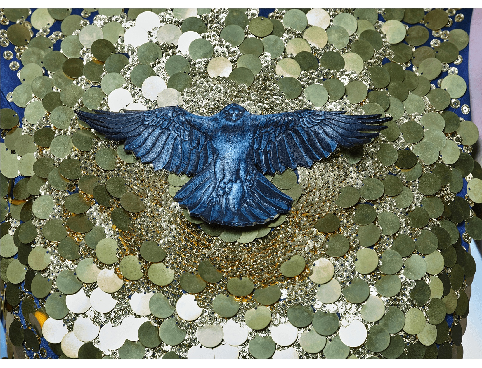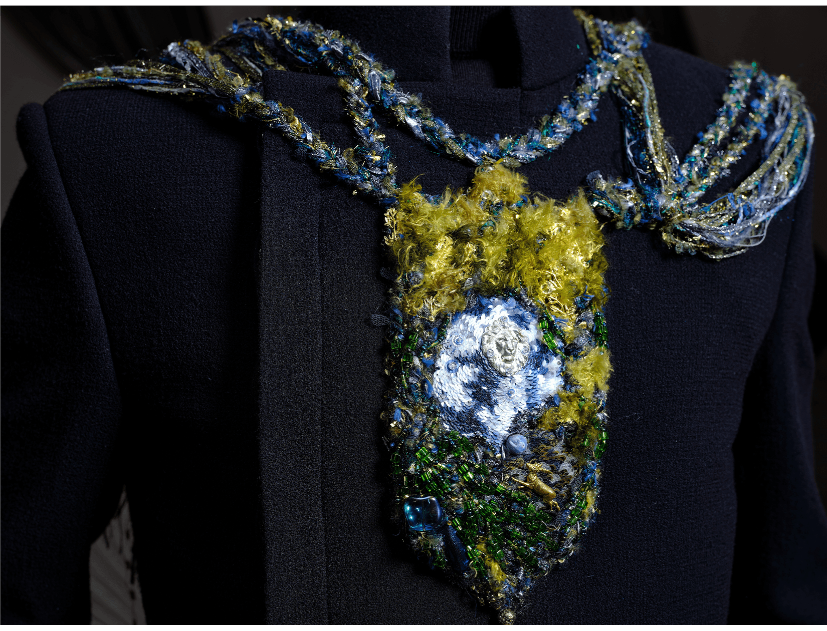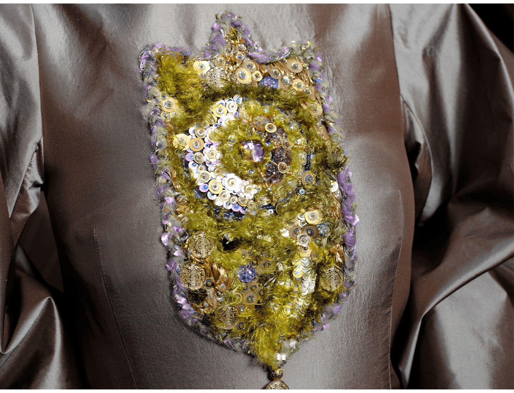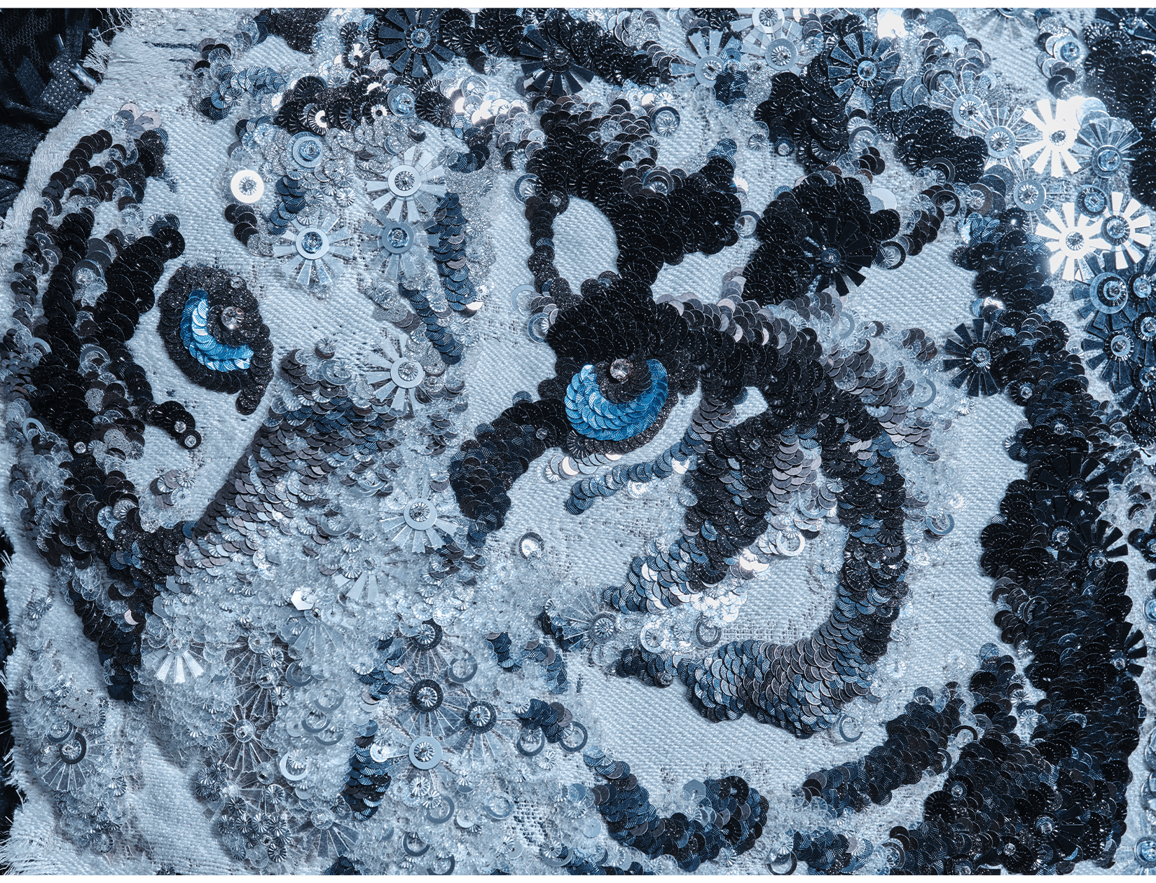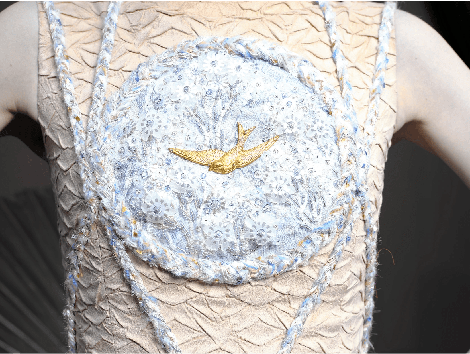 In conventional French couture embroidery, coloured thread is used as a distinctive decorative element. It is often combined with sequins, rhinestones, or feathers, allowing materials to be rapidly chained together to create dense, opulent surfaces. This effect can be striking and theatrical; however, the reliance on single threads, larger needles, and a lack of consideration for the weight and tension of the embellishments often leads to structural issues. Over time, many such embroideries loosen, shed elements, or pull and distort the base fabric.